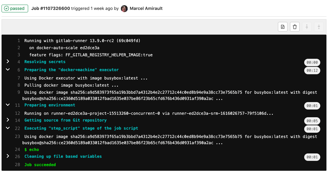 \r\e[0K: Prevents the section markers from displaying in the rendered (colored) job log, but they are displayed in the raw job log. To see them, in the top right of the job log, click {doc-text} (Show complete raw).-