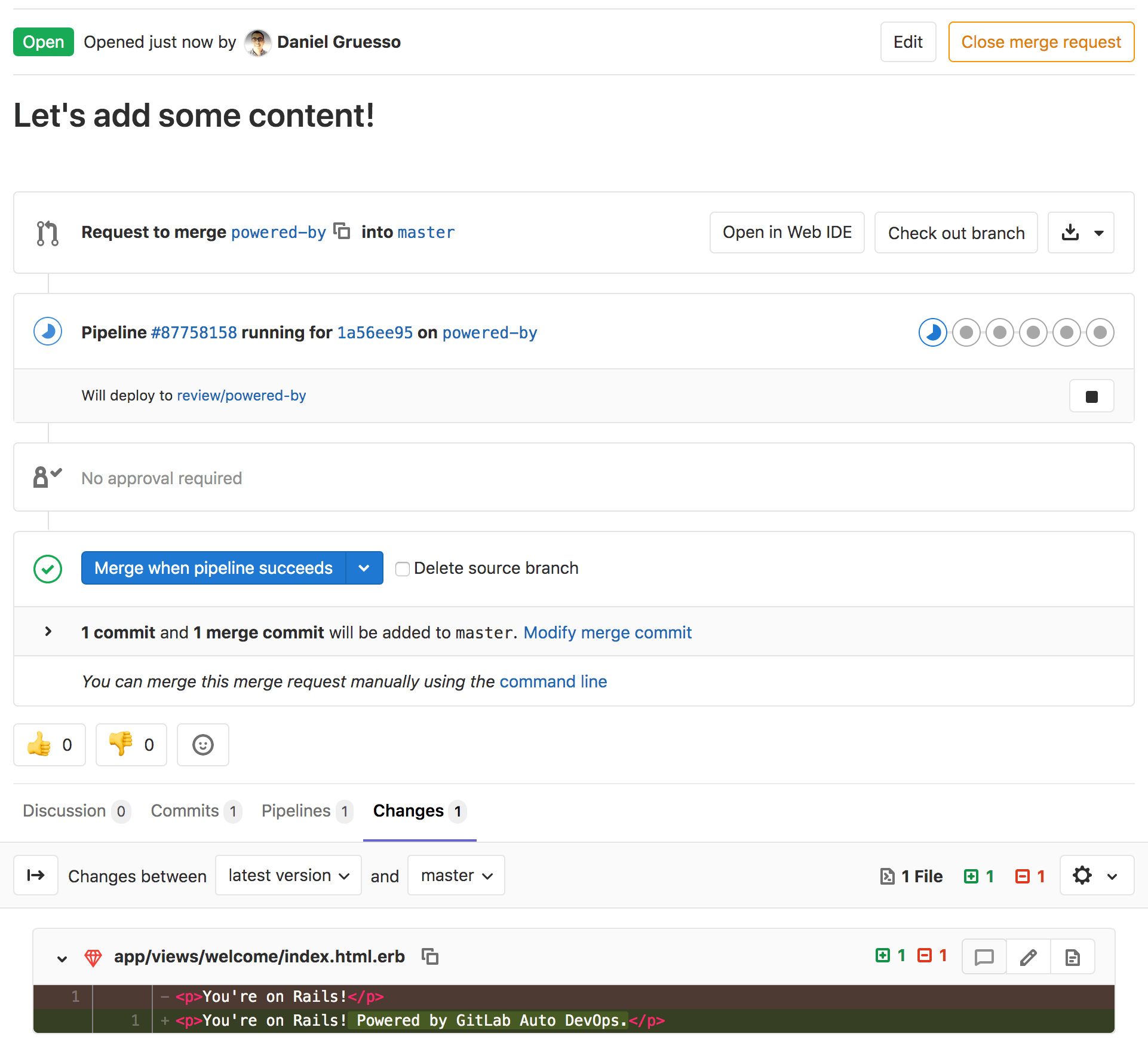 Return to the Overview page of your merge request, and you should not only see the test passing, but also the application deployed as a review application. You can visit it by selecting the View app {external-link} button to see your changes deployed.