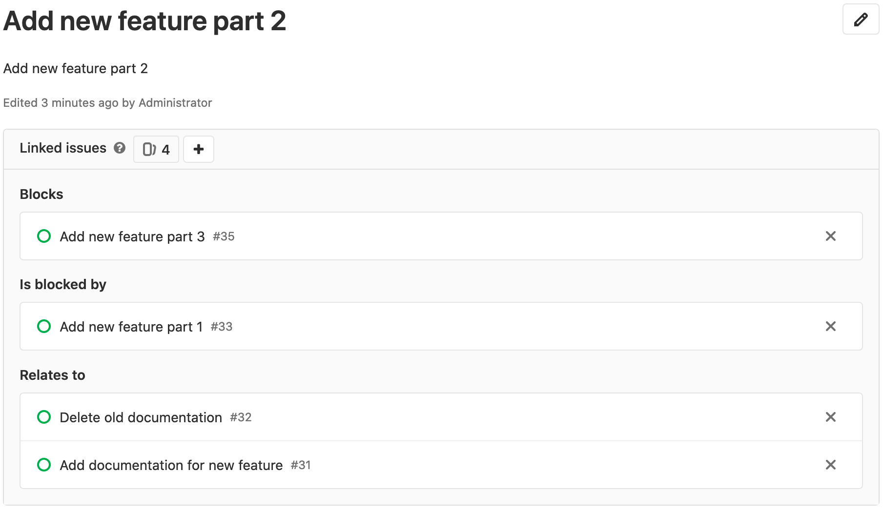 You can also add a linked issue from a commit message or the description in another issue or MR. Learn more about crosslinking issues.