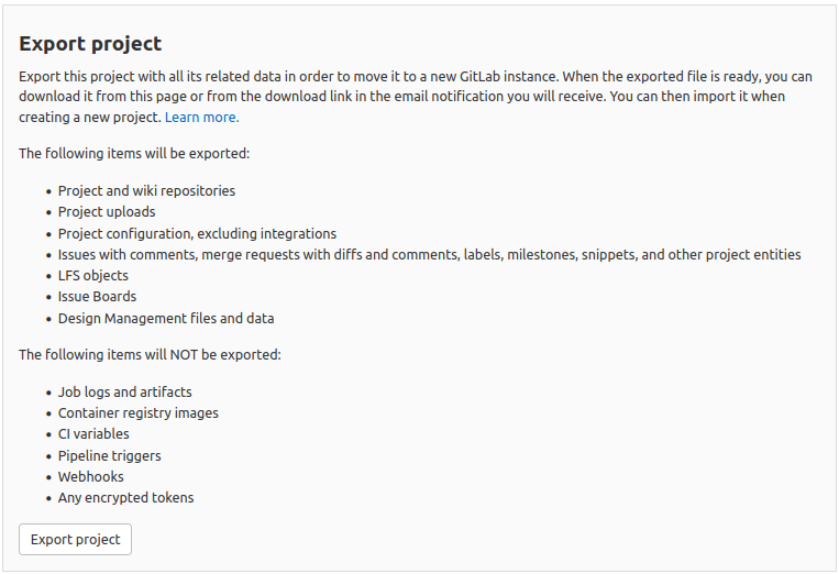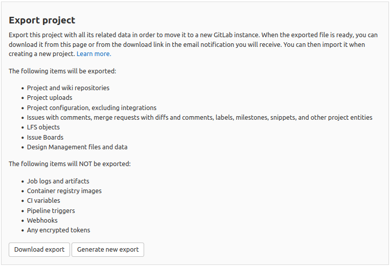 - Imports fail unless the import and export GitLab instances are compatible as described in the Version history.