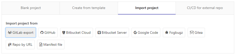 The GitLab project import feature is the first import option when creating a new project. Select GitLab export: