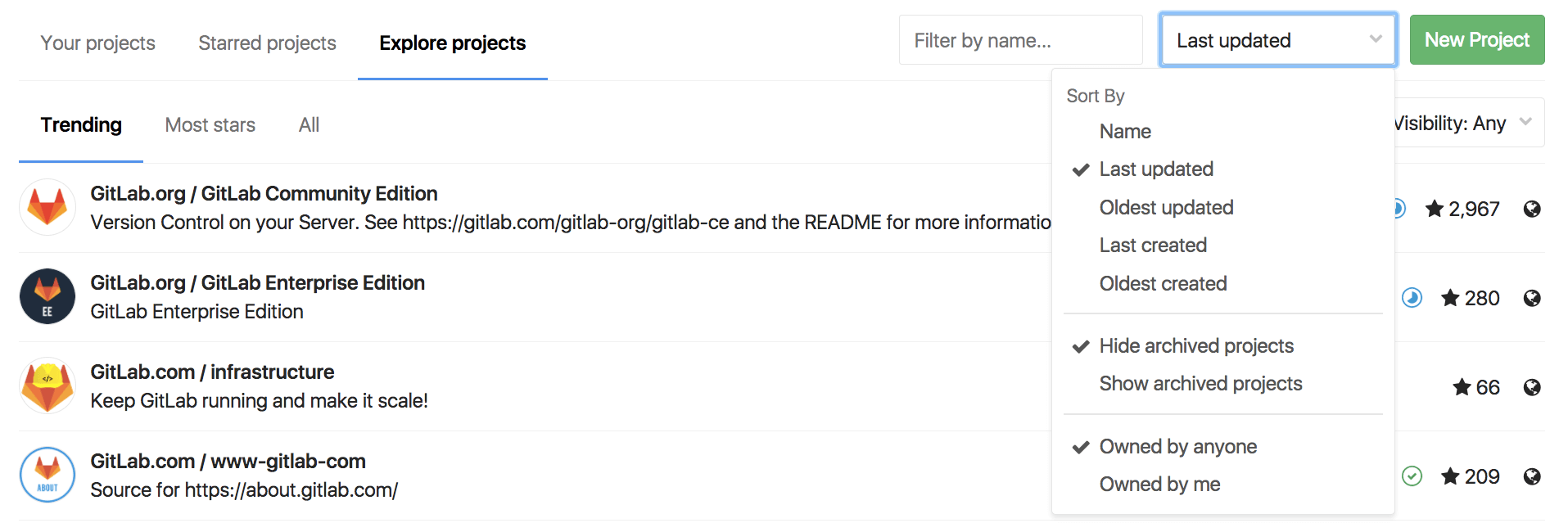 You can also look for the projects you starred (Starred projects). You can Explore all public and internal projects available in GitLab.com, from which you can filter by visibility, through Trending, best rated with Most stars, or All of them.